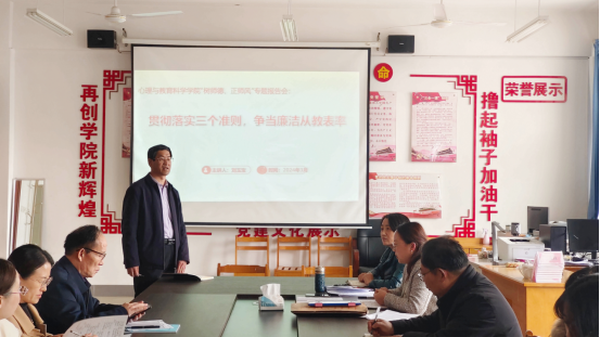 党总支书记刘玉宝首先从深入学习贯彻三个准则、高校更需要深入贯彻落实三个准则、廉洁从教从我做起,从现在做起三个方面展开报告;通过一系列国家政策精神和高校中违反职业行为的案例,引导高校教师严守“底线”、勇攀“高线”;最后通过对教师职责的阐述,要求全体教职工务必要严肃政治纪律和政治规矩,严守师德师风底线和红线,树立正确的世界观、人生观、价值观。