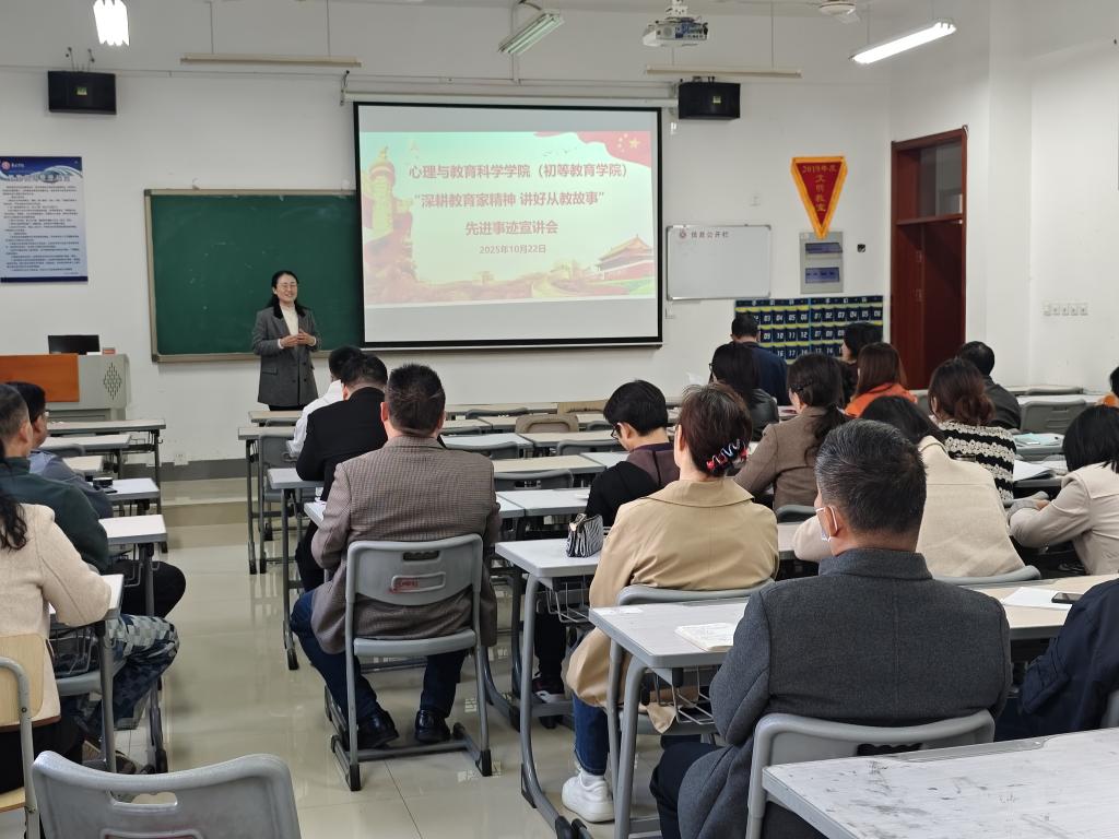 宣讲会上,来自教学一线的先进教师代表徐愫芬分享从教故事。徐老师结合自身工作经历,从不同角度讲述了践行教育家精神的实践历程,生动展现了在课程教学、科研创新、员工培养等方面的坚守与担当,真挚的情感、鲜活的事例引发了现场教师的强烈共鸣,同时希望全体教师继续坚守初心,以德立身、以德立学、以德施教,积极传承并发扬“教育家精神”。