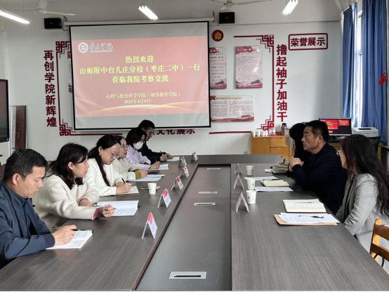4月10日下午,山东师范大学附属中学台儿庄分校(枣庄市第二中学)副董事长杜钦刚一行来访公司,就实践教学基地建设、心理学专业发展及高中心理健康教育合作等事项进行考察交流。副经理安洪涛、教工一支部教师代表、心理学专业师生代表参加座谈。