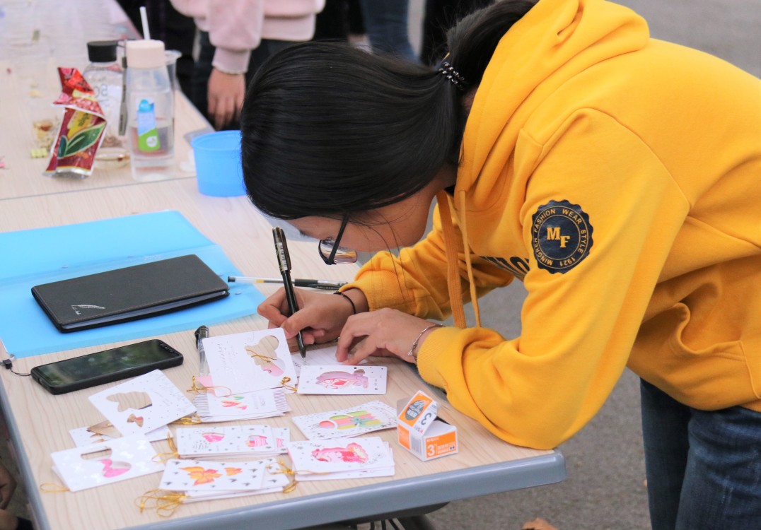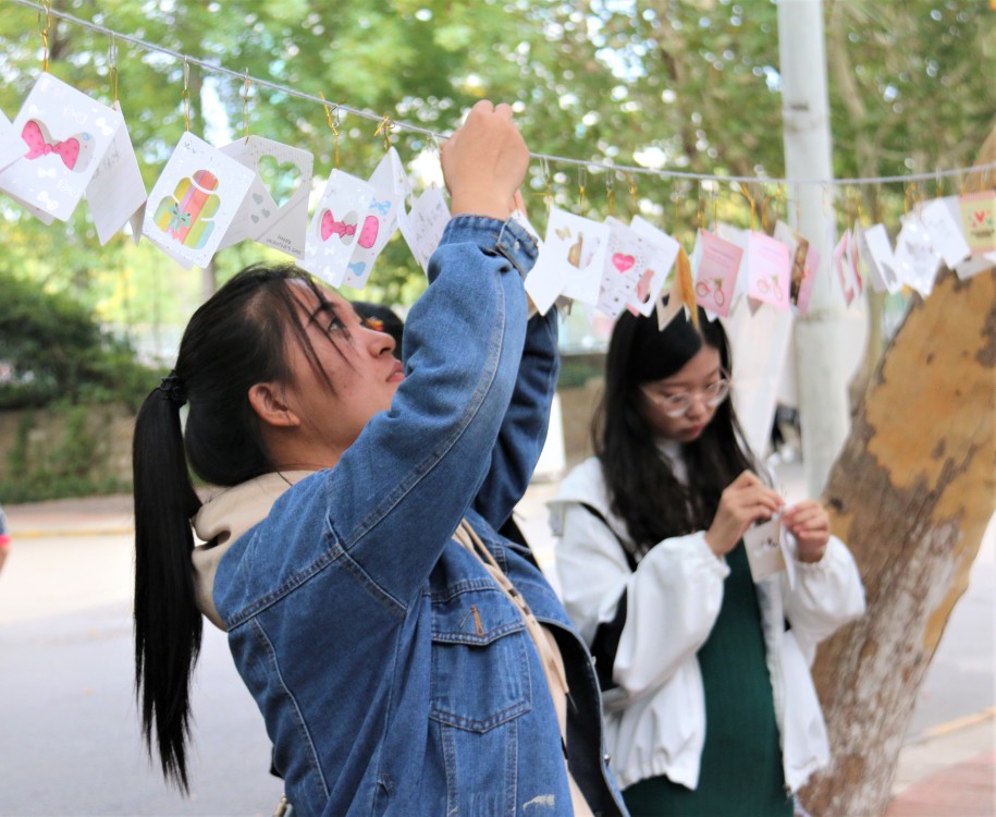 活动开始前,相关工作人员悬挂好横幅以及与重阳节相关的书画作品,为活动进行做了充足准备。下午两点半,活动准时开始,各社团工作人员秉着“奉献,友爱,互助,进步”的志愿者精神积极的帮助参加活动的同学们,热情的为他们送上明信片,同学们在明信片上写下自己对亲朋好友的牵挂与祝福,随后志愿者们将同学们所写的明信片悬挂在绳子上进行展示。与此同时,本草社的工作人员为参与活动的同学们送上饱含着浓浓情意的菊花茶、茉莉花茶等。同学们一边喝着茶一边欣赏着有关重阳节的书画作品,深切的感受到了重阳节的浓厚氛围。下午四点半,活动在同学们的一致好评中结束,工作人员合影 留念,活动圆满结束。