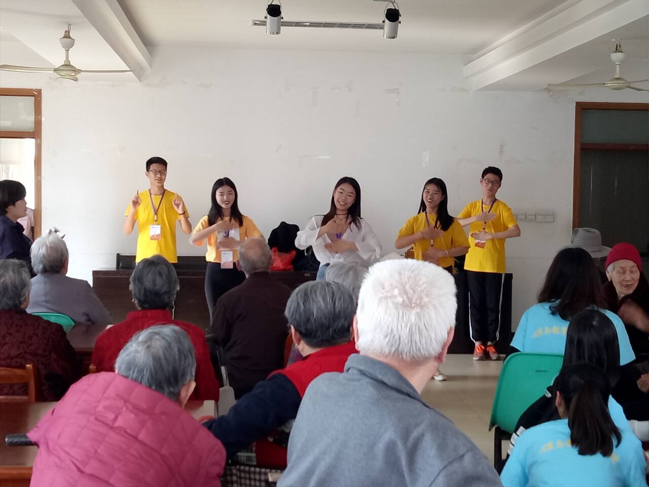 活动中,志愿者们陪老人聊天,老人们向志愿者介绍了日常生活及娱乐活动安排,讲述了他们过去的故事,志愿者们认真聆听。手语舞蹈队的志愿者们表演了手语《最美的太阳》,展现了该院的专业特色,激起了老人们的学习兴趣,老人们跟着志愿者认真的学习手语,王奶奶说:“学手语很有意思,还能活动我们的手指”。