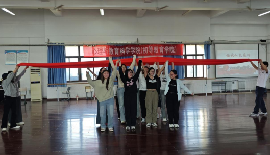 接下来的《信仰之链》环节中,一条红色绸布成为全场焦点。同学们依次用身体传递这条象征信仰与革命精神的红绸布,既考验协作能力,也象征精神薪火的传承。全体成员接力完成,形成一条延绵不断的“红色信仰链”,寓意红色精神在新时代青年中不断传递、生生不息。