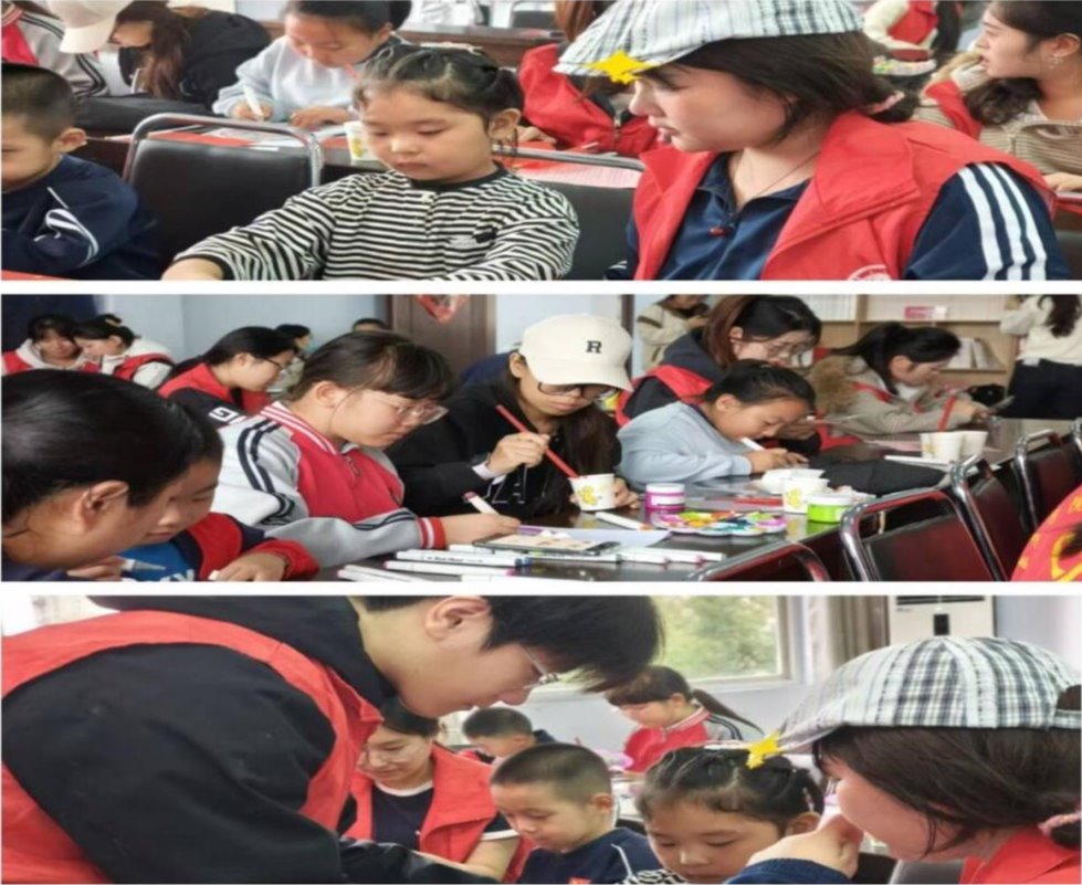 活动伊始,志愿者们以精心制作的PPT,结合生动的抗日题材动画,带领现场儿童回溯那段烽火岁月,为活动拉开庄重序幕,在授课环节,教唱经典歌曲《歌唱祖国》,激昂的旋律在现场回荡,爱国之情在孩子们心中悄然升腾。创作环节,孩子们自主选择A4纸绘画、扇子DIY或剪纸,志愿者们分区开展专业且耐心的指导,巧妙将抗战元素融入创作中,引导孩子们以艺术之笔致敬革命先烈、诉说家国情怀。创作结束后,小朋友们踊跃登台展示作品,声情并茂地分享“为何这样画、这样剪”,每一件作品都饱含着对英雄的崇敬与对和平的向往。在热烈的氛围中,全体青年志愿者与小朋友们共同合影留念,定格下这一传承红色精神、培育时代新人的珍贵瞬间。