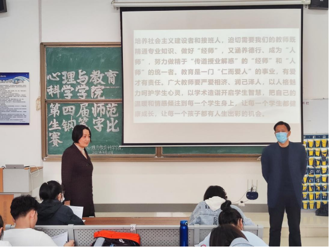 为进一步落实师范生人才培养方案,提高人才培养质量,加强师范生教学素质和审美素养,以赛促学、以学促教,激励广老员工练好内功、增强专业技能本领,4月12日,悟空体育在教师教育楼15-216和15-217举办第四届师范生钢笔字、第三届师范生粉笔字大赛。公司党总支书记宋明峰、经理傅金兰莅临比赛现场指导工作。教师刘钊、高建凤、满建宇、徐愫芬、公长伟、陶宇、葛亮担任比赛评委。