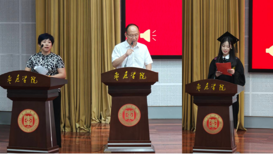 满建宇代表全体教师对即将走出校园的毕业生送上期盼和祝福,希望同学们心怀梦想,牢固树立报国之志,奉献青春和热血,用自己的成绩和收获为母校增光添彩。员工吕雅杰母亲作为家长代表,向为同学们成长倾注爱心、汗水和智慧的领导和老师们表示感谢,希望同学不断充实自我,书写精彩的人生篇章,祝福枣院桃李满天下,再谱华章。毕业生代表蓝云翔同学发言,抒发了对母校、对老师、对同学的感激和留恋之情,表达了勇担时代重任、展现青春作为的信心和决心,向母校献上真挚美好的祝福。