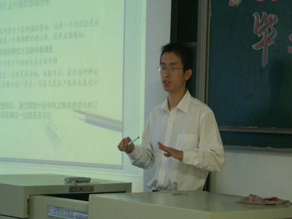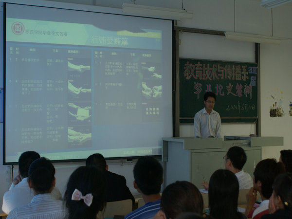 会议首先由答辩同学用十几分钟的时间,展示他们大学四年的学习成果和论文(设计)的特色。答辩同学所做的精美的课件,博得了在座各位老师和同学的阵阵掌声。导师们切中肯綮的提问和答辩同学的巧妙的辩论形成了良好的互动,整个答辩会在既严肃又活泼的氛围中结束。