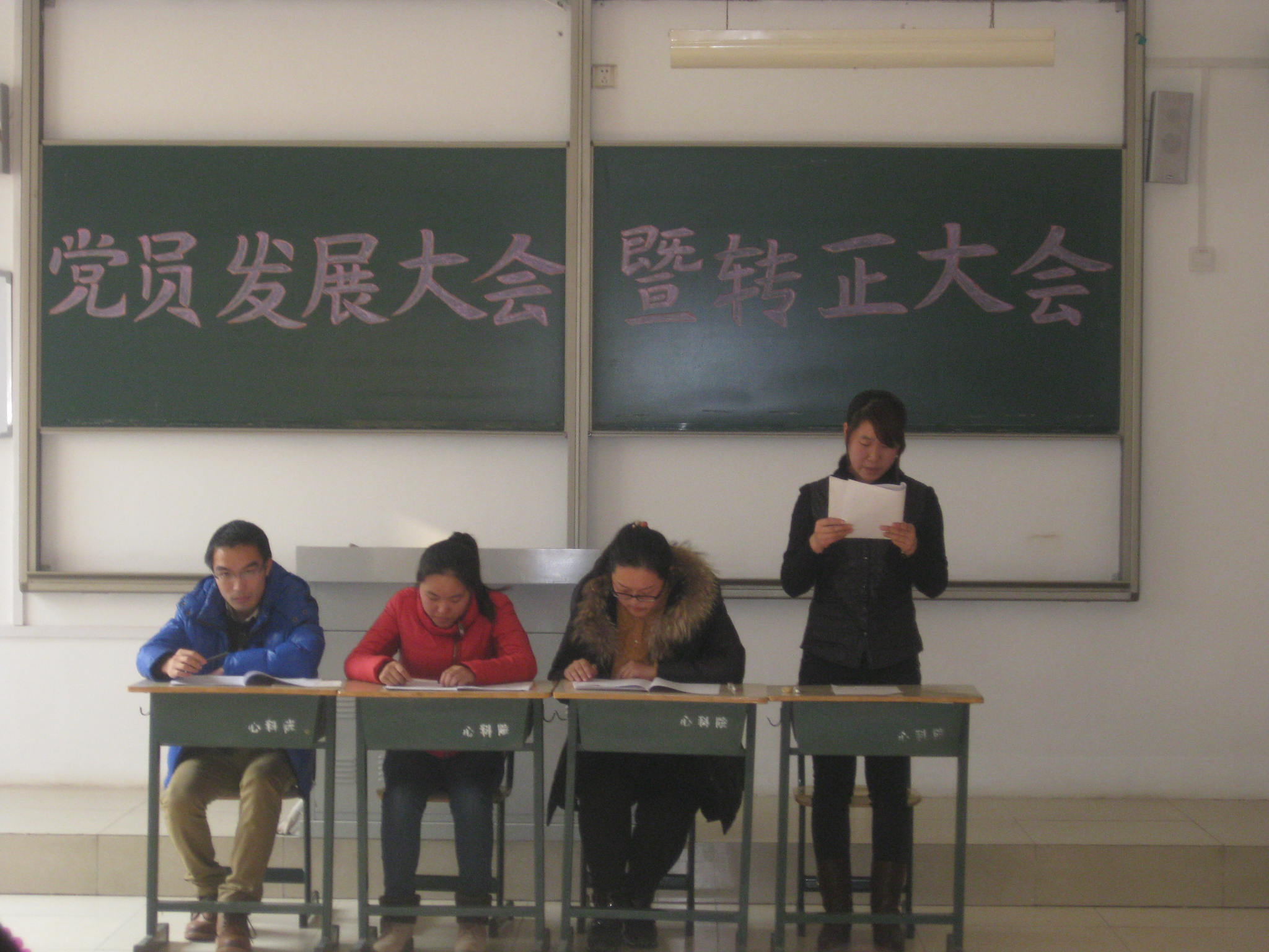 接着,入党积极分子逐一宣读《入党志愿书》,并介绍自己的入党动机,他们无不真情的表达了对党的向往、对党的忠诚,表示坚定不移跟党走,为党的工作付出自己的力量,为共产主义事业奋斗终生。入党介绍人、考察人详细介绍了培养、考察的整个过程及在校表现情况,与会党员进行讨论并充分发表各自意见,拥有表决权的党员对预备党员进行了投票表决,最终4名同学通过决议,被接收成为预备党员。另外11位预备党员依次宣读转正申请、简述一年内预备期的发展情况后,由支部成员宣读党组织对11人的考察决定,随后党员举手表决一致通过,同意按期转正。