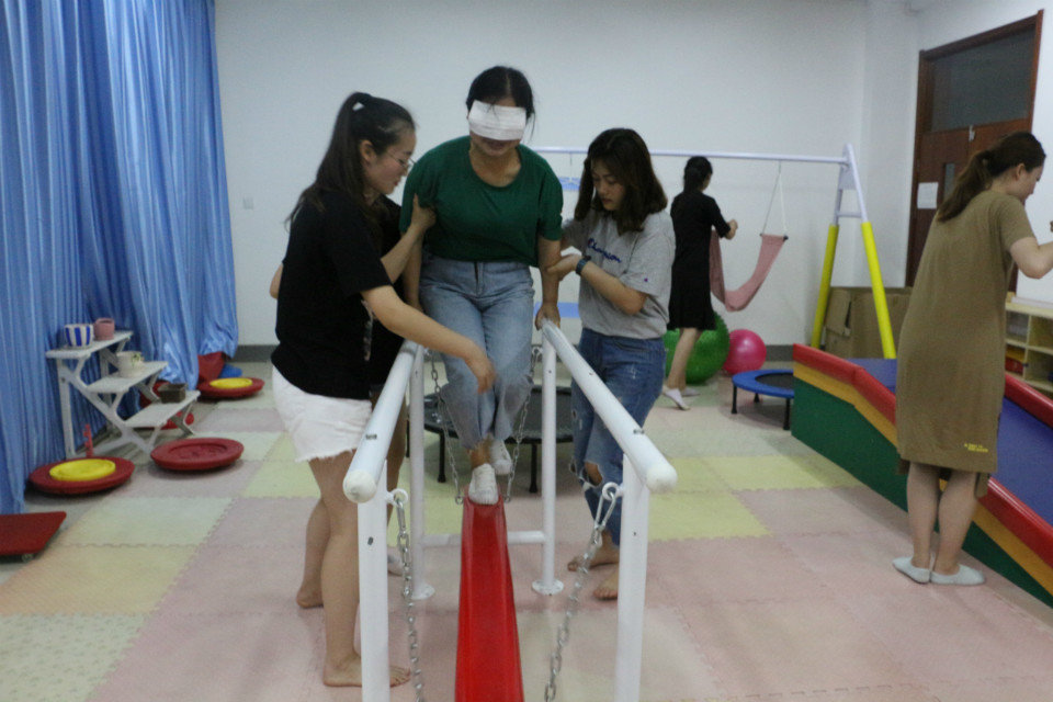 随后,辅导员带着全体同学在感统训练室里进行了团体心理辅导活动,同学们分成两组分别扮演失语者和盲人手携手一起走过“成长之路”。活动过后,辅导员在较昏暗的环境中借助朗诵的形式和同学们一起回顾了刚刚走过的“成长之路”,从社会、朋友、老师、父母等方面为同学们讲到了爱心、责任、信任、尊重、感恩等思想道德素质。同学们互帮互助、携手同行的回忆让同学们纷纷留下了眼泪。最后请同学们分享感受,刘文杰同学说:“班会非常成功,对我们每个人来讲都是一次心灵的震撼。非常感谢我的小伙伴在刚才充满艰难险阻的道路上给我的帮助,让我在看不到的情况下感受到了安稳。使我们从内心之中得到了成长。”