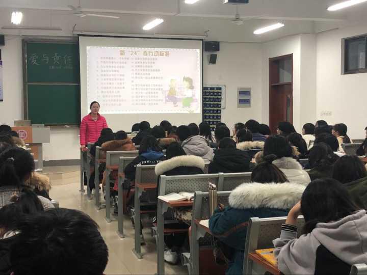 2018年12月20日,悟空体育2018级学前教育本科一班、二班共同组织开展了“爱与责任”主题班会。辅导员张倩、学前教育本科一班、二班全体员工参加本次班会。