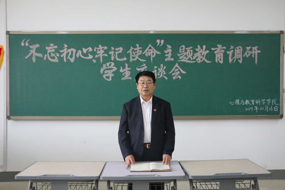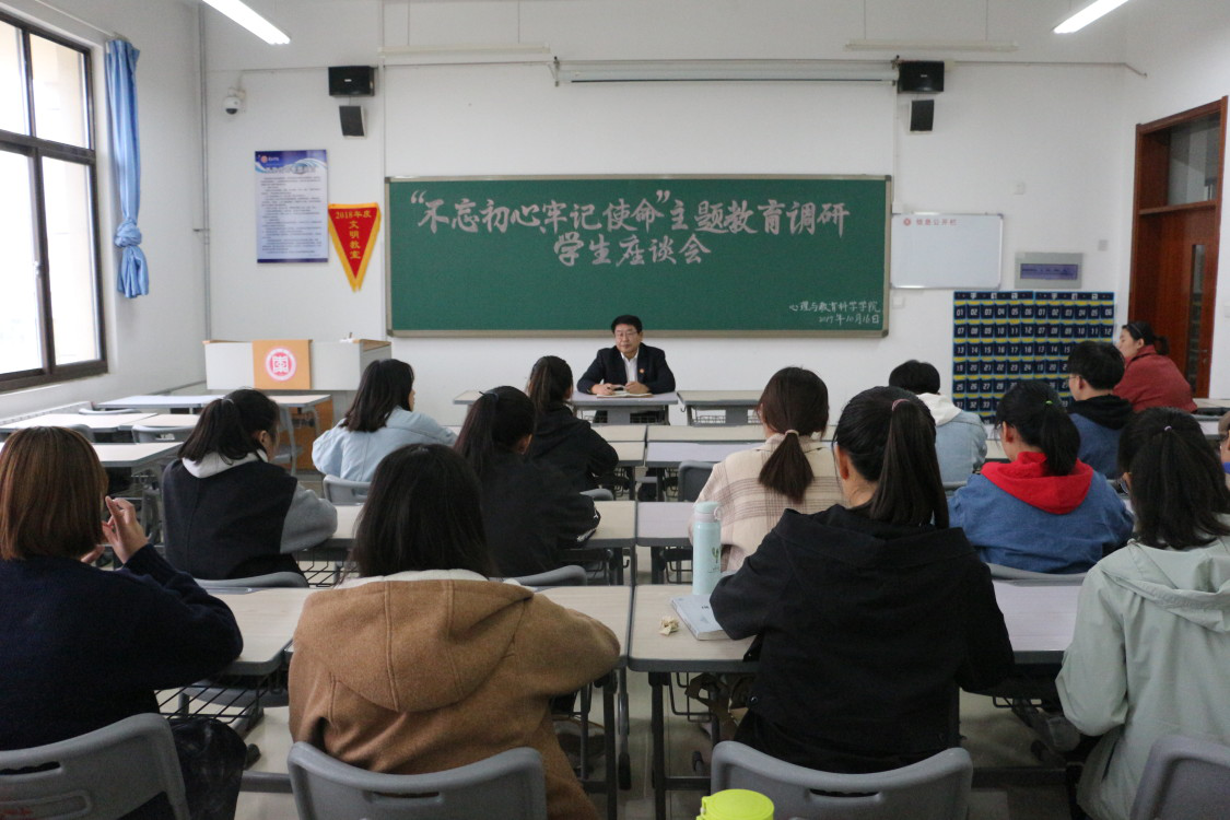 10月16日,公司于教师教育楼312室举行“不忘初心、牢记使命”主题教育蹲班调研员工座谈会。公司党总支书记赵荣军出席,2018级小学教育1班师生共三十余人参会。