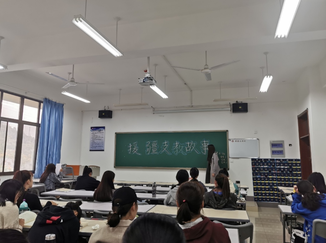 首先,各班班长介绍了援疆支教政策以及公司支教员工赴喀什地区疏勒县支教的现状。然后,在班长的带领下,同学们一起阅读支教日记,深切体会到喀什地区教育资源尤其是汉语教育的薄弱和亟待发展的紧迫,提升了对援疆支教的热情和责任感。最后,同学们进行了交流讨论,大家纷纷表示:“作为青年人,我们要有担当意识和奉献精神,学好科学文化知识,努力提高个人素质,日后积极投身到祖国需要的地方。”