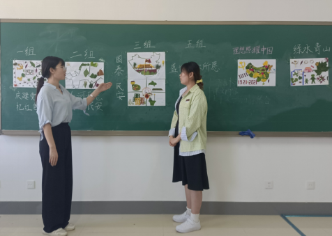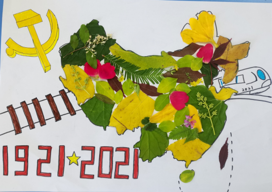 创作理念:整幅作品以中国地图为主体。中国,曾经遭受过伤痛,当侵略者的铁蹄踏上我们祖国的土地的时候,是中国共产党带领人民英勇拼搏,将侵略者赶出中国去。100年的风雨历程,中国共产党带领人民,前仆后继,顽强奋斗,把贫穷落后的旧中国变成日益富强的新中国。我们用不同的叶子代表不同的地方,说明各个地方都有各自的特色,在中国共产党的带领下,全国各地人民团结一致,共克时艰,不管是抗震救灾,还是应对此次的新冠疫情,都体现了中华民族的凝聚力。叶子也代表着环保,绿水青山就是金山银山,环境保护对于我国来说至关重要,在党和人民的共同努力下,我们的环境一定会变得越来越好。中国高铁见证了中国速度,它用一张张的铁路网,将祖国大地汇聚在一起。在建党100周年之际我们立下宏愿:紧紧跟随党的领导,热爱祖国,勤奋学习,积极实践,用我们的双手共筑美好的中国梦。