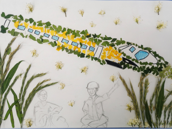 创作理念:一辆高铁穿梭过稻田,稻田间坐着袁隆平爷爷和高铁工人。工人指着呼啸而过的高铁说:你看!这是我参与建造的高铁!跑的可快了呢!袁爷爷说:你看!这是我种植出的水稻!我们实现了禾下乘凉梦。白色的小花代表以前的所有大国工匠和我们现在的年轻一代人,不管是大国工匠们还是我们都会为了中华民族的伟大复兴而努力,为实现中国梦奋斗终生!