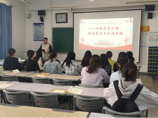 悟空体育教工第二党支部书记傅金兰在公司会议室讲授题目为《学习重温中央八项规定 加强师德师风建设》党课,傅金兰经理阐述了学习教育背景与意义,讲授了习近平总书记关于党的作风建设的相关论述,对中央八项规定精神进行解读。傅金兰要求全体党员干部应全面理解规定,增强敬畏之心,内化为自觉意识,外化为实际行动,做到令行禁止,树立良好作风。