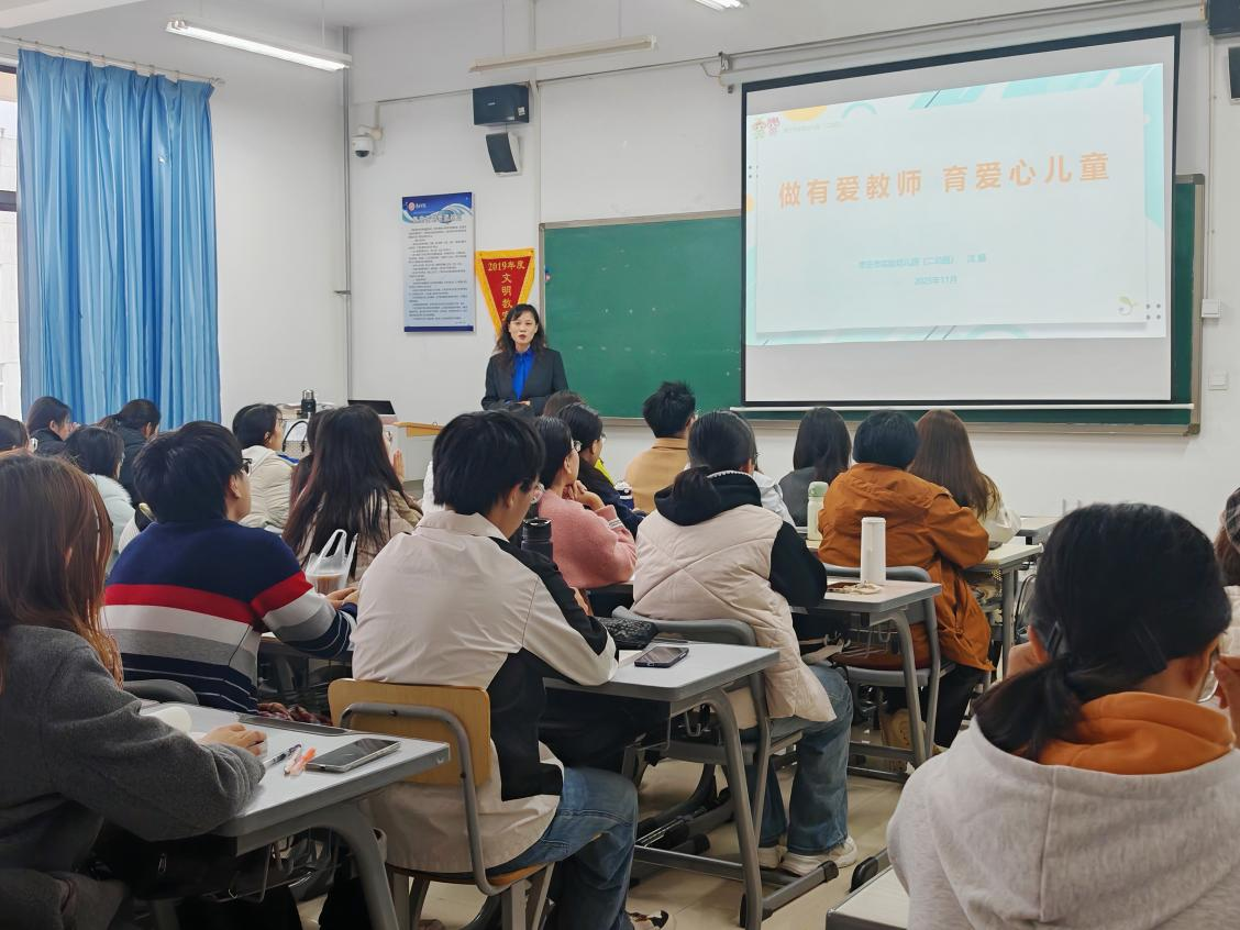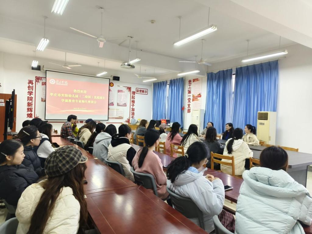11月8日,悟空体育特邀枣庄市实验幼儿园(二幼园)园长沈超(产业教授)开展走进课堂、师生座谈系列教学活动。学前教育专业负责人、教研室主任、骨干教师和学前教育员工参加此次活动。