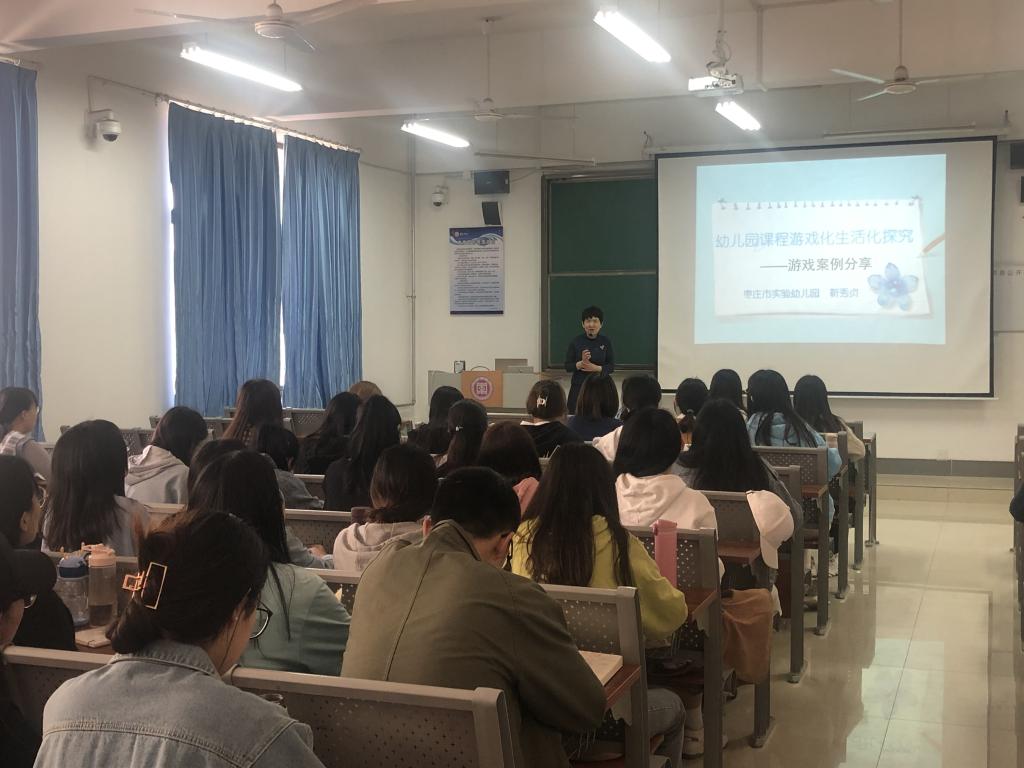 4月10日,靳秀贞园长走进课堂为2018级学前教育本科班员工带来了一堂精彩的关于幼儿园主题教育活动的实践指导课。