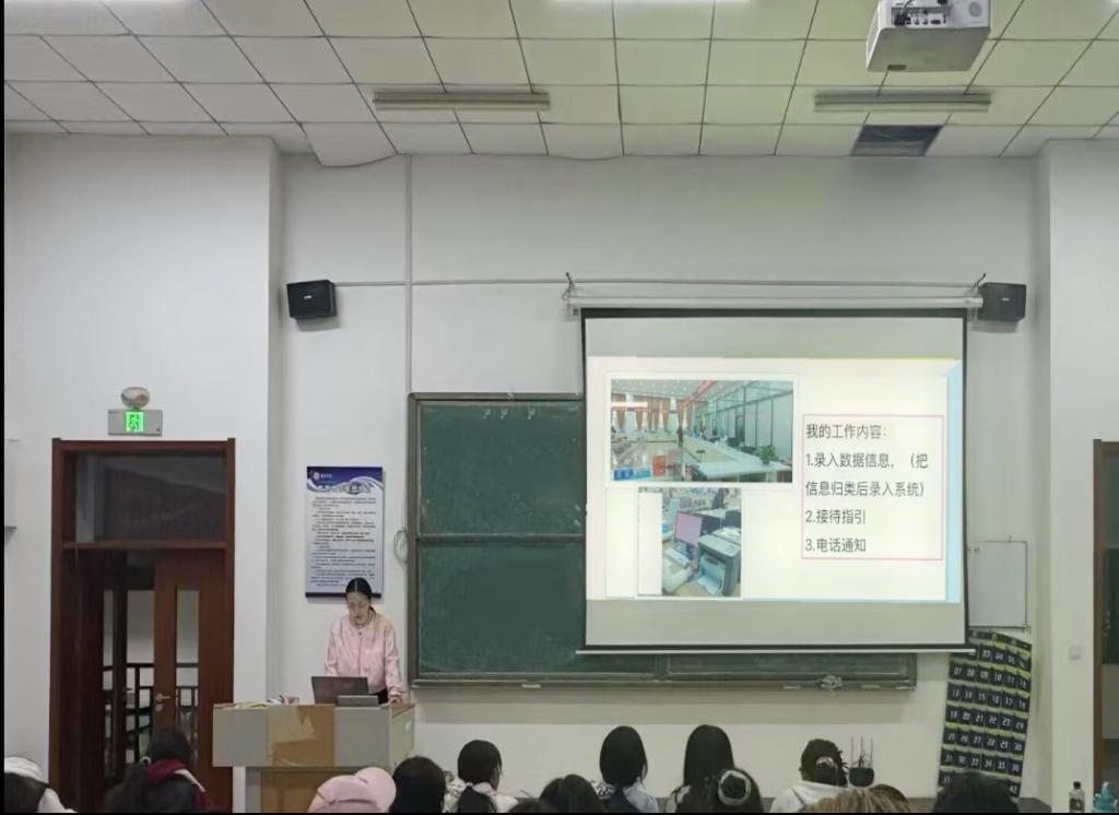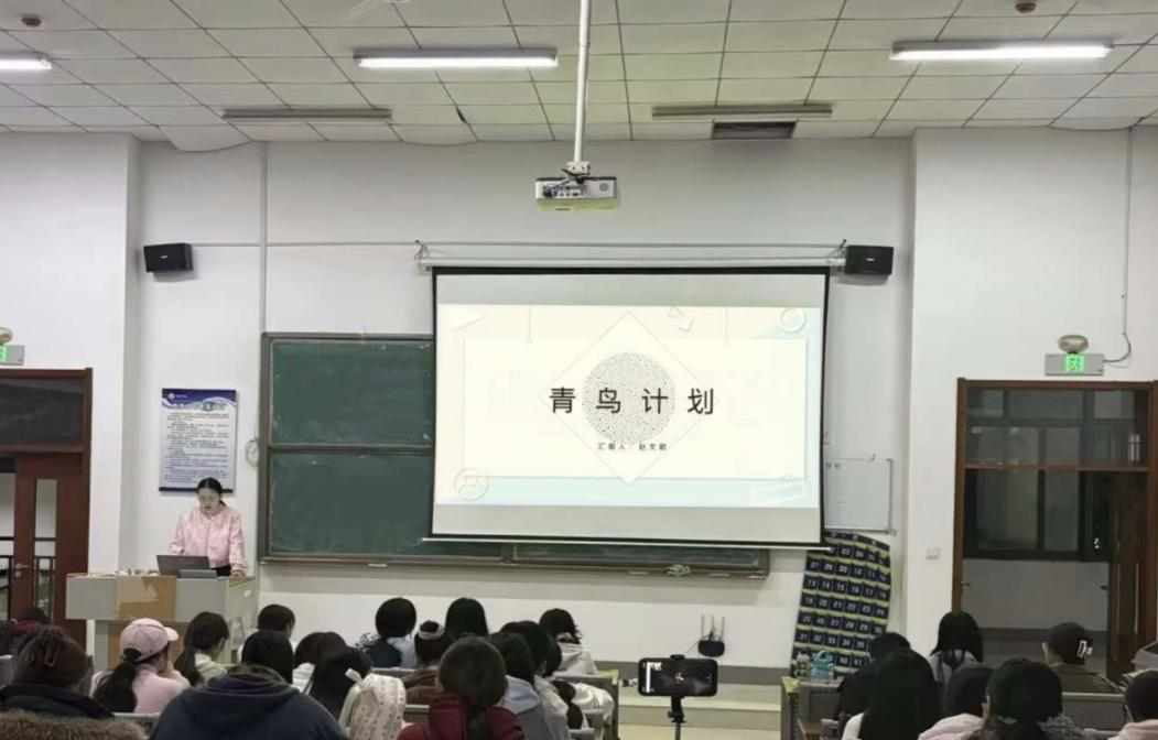 活动中,宣讲人以PPT展示的形式,从青鸟计划的项目背景、报名渠道、录取详情、岗位内容等方面展开讲解。她介绍了青鸟计划是2019年团省委联合省人社厅推出的就业创业助力项目,讲解了通过青鸟计划APP填报信息的报名方式,以及录取难度低、按报名顺序录取、部分岗位有补助等录取特点;同时结合自身实践经历,展示了实践中的工作内容、实操场景与具体工作流程,生动讲述了在实践岗位上的工作日常与实操体验,让在场同学直观了解青鸟计划的实践模式与岗位要求。